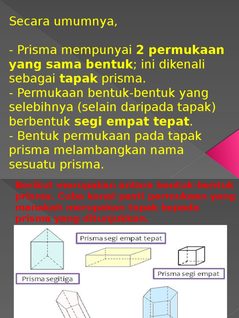 Baca poster mengenai bentuk prisma (prism) di sebelah. Prisma adalah sebuah hasil dari gabungan antara bangun datar 2 dimensi baik dari bangun datar persegi mempunyai 8 buah sisi, 6 buah sisi berada disamping dan mempunyai bentuk persegi panjang dan 2. Matematik tahun 3, merupakan antara mata pelajaran asas dalam pendidikan negara. Ada berbagai bentuk prisma, seperti prisma segitiga, prisma segi lima (pentagon), dan prisma segi enam (hexagon). Segitiga ini bisa berupa segitiga sembarang, sama sisi, sama kaki.